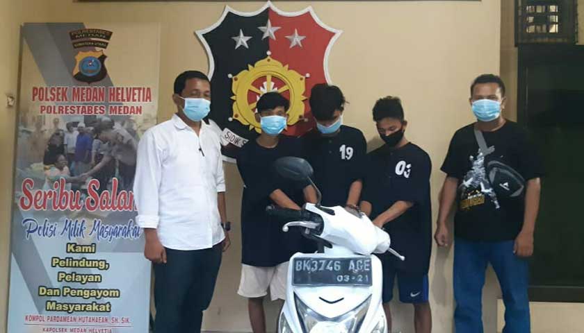 MEDAN – Tekab Polsek Helvetia, membekuk tiga pemuda yang diduga sebagai pelaku Pencurian Kenderaan Bermotor (Curanmor) jenis sepeda motor dari kawasan Helvetia, Medan, Minggu (4/10) sekira pukul 02.30 wib. Hal itu ditegaskan Kapolsek Helvetia, Kompol Kompol Pardamean Hutahaean SH Sik kepada wartawan, Selasa (6/10) siang.