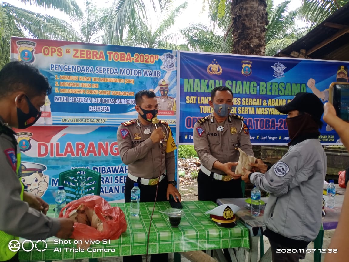 SERDANG BEDAGAI – Dengan berakhirnya Operasi Zebra Toba 2020 yang dilaksanakan selama 14 hari dari tanggal 26 Oktober sampai 8 November 2020, Satuan Lalu Lintas (Satlantas) Polres Serdang Bedagai tatap muka sekaligus makan siang bersama dengan penarik Ojek dan Becak di Pos Lantas Sei Bamban, Sabtu (7/11/2020) siang.