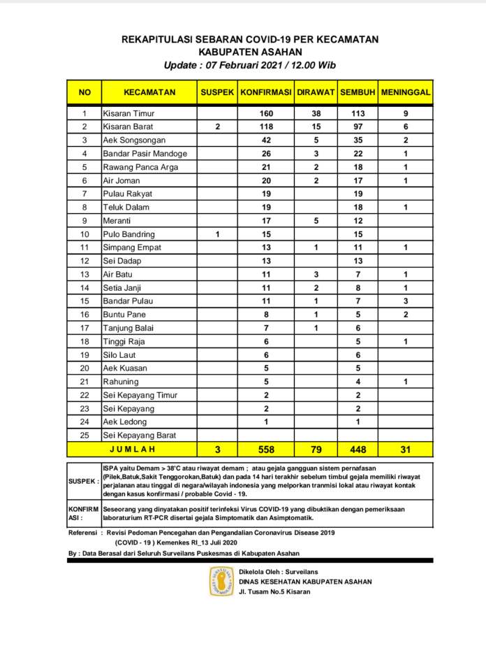 Dari 558 orang warga Asahan yang Konfirmasi tersebut sebanyak 79 orang dalam perawatan, 448 orang telah dinyatakan sembuh dan 31 orang meninggal dunia serta ada 3 warga yang Suspek.