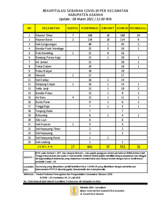 Data Update tersebut disampaikan Juru Bicara Satuan Tugas Percepatan Penanganan Covid – 19 Kabupaten Asahan H. Rahmat Hidayat Siregar S. Sos. M.Si, senin (08/03/2021) berdasarkan hasil data surveilans dari seluruh Puskesmas yang ada di wilayah Kabupaten Asahan sebagaimana di kelola Dinas Kesehatan Kabupaten Asahan pertanggal 08 Maret 2021 hingga pukul 12.00 Wib.