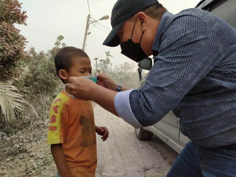 TANAH KARO – Pasca terjadinya luncuran awan panas disertai Erupsi Gunung Api Sinabung. SMSI Kabupaten Karo spontan melakukan pembagian masker bagi warga desa yang terdampak material abu vulkanik Sonabung, Selasa (2/3/2021) di Kecamatan Tiga Nderket dan Kutabuluh.