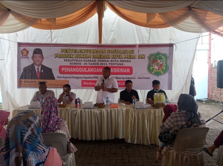 MEDAN-Anggota DPRD Medan, Surianto, SH, menggelar Sosialisasi Perda Kota Medan No.5 Tahun 2015 tentang penanggulangan kemiskinan yang berlangsung di Marelan Holl, Pasar 4 Barat, kelurahan Rengas Pulau kecamatan Medan Marelan, Minggu (5/03/2023).