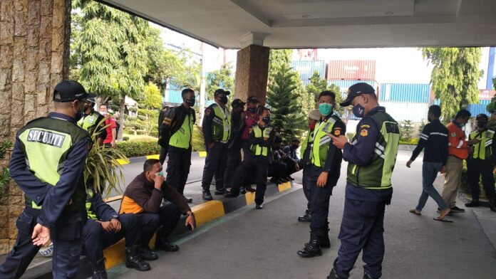 BELAWAN– realitasonline.id | Puluhan buruh satuan keamanan Security Belawan Internasional Container Terminal (BICT) Pelindo 1 di Jl Pelabuhan Raya Kelurahan Bagandeli Kecamatan Medan Belawan Provinsi Sumatera Utara gelar aksi unjuk rasa, Kamis (6/5/2021). Mereka menuntut perusahaan membayar THR secara penuh.