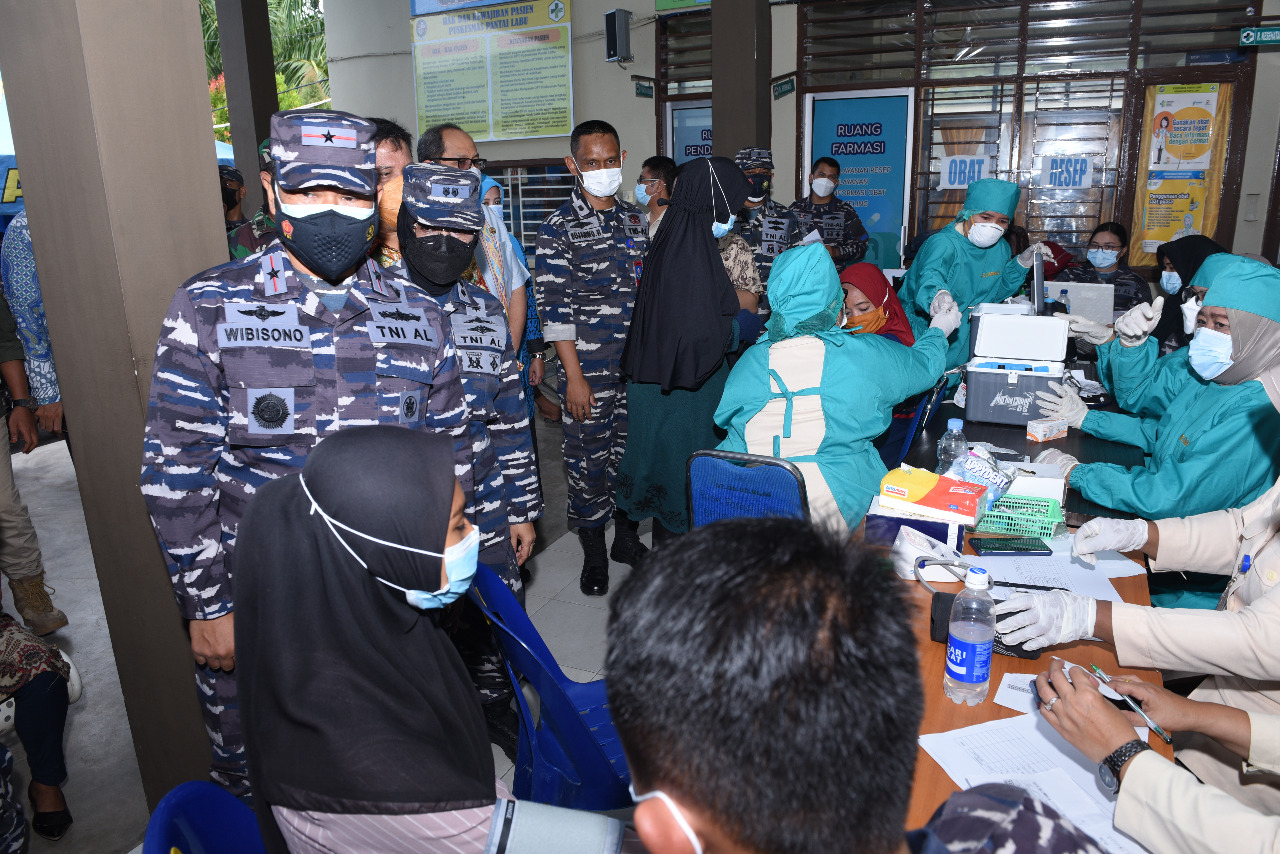 Komandan Pangkalan Utama TNI Angkatan Laut I Laksamana Pertama Achmad Wibisono meninjau langsung dilokasi pelaksanaan vaksinasi massal bertempat di Puskesmas Pantai Labu Kecamatan Pantai Labu Kabupaten Deli Serdang didampingi oleh Sekda Kabupaten Deli Serdang Bapak Darwin Zein, S. Sos dan Ws. Wadan Lantamal I Kolonel Laut (P) Sunar Solehuddin, S.H., Pejabat Utama, Kadis, Kasatker Lantamal I.