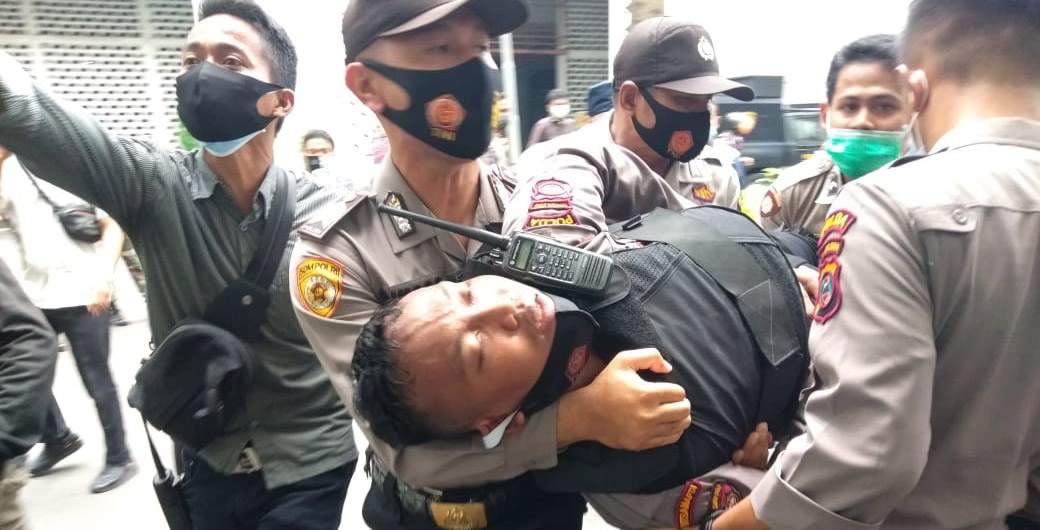 Unjukrasa ribuan massa dari berbagai elemen masyarakat dan mahasiswa ke DPRD Sumut, Medan, Sumatera Utara, mulai main lempar baru dan botol air mineral, pada Kamis (8/10/2020).