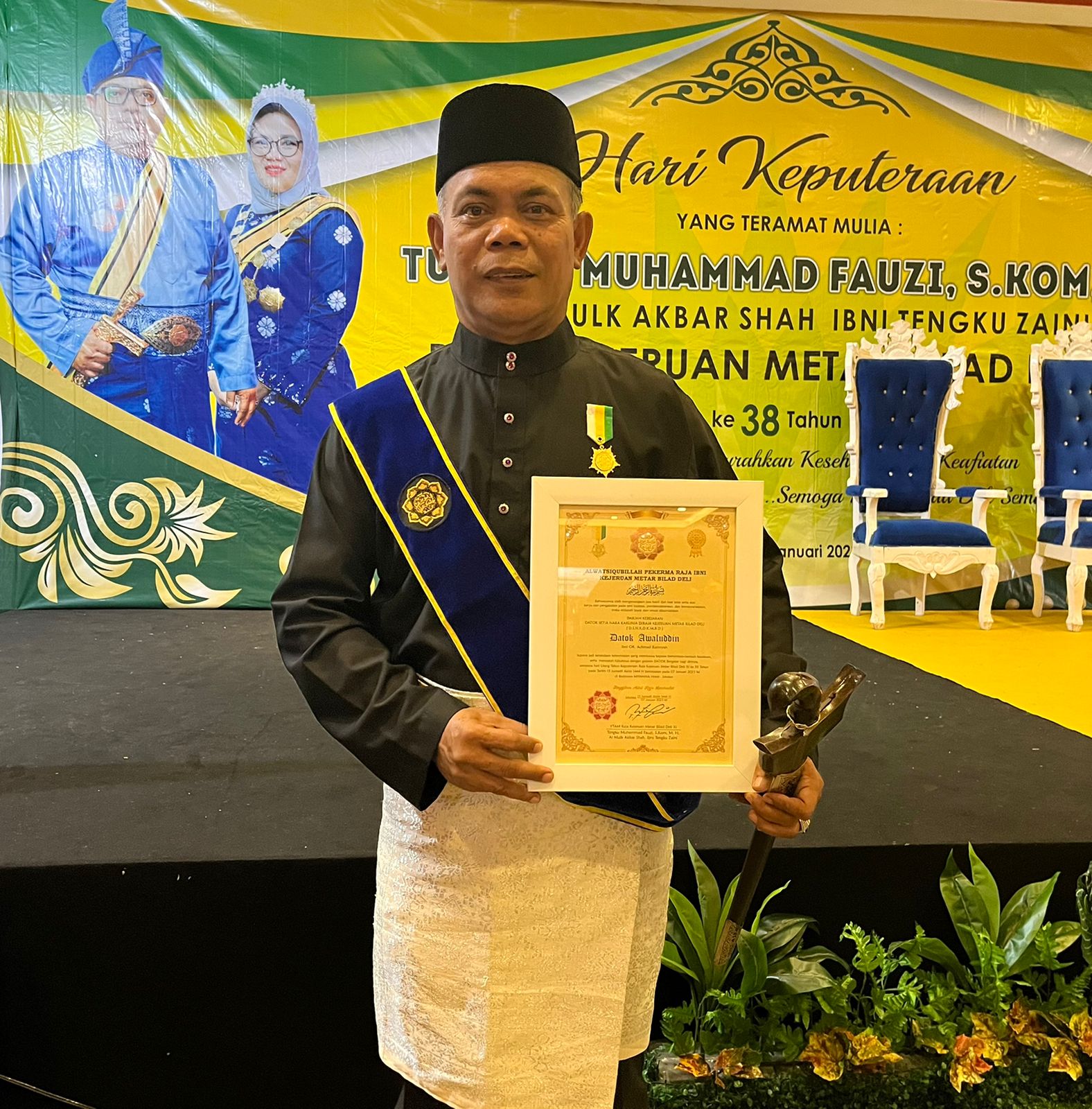 Penyerahan tanda kehormatan gelar dan selempang Kejeruan Metar Bilad Deli diberikan langsung oleh Raja Kejeruan Metar Bilad Deli XI YTAM Tuanku Muhammad Fauzi. S.Kom, M.H Gelar Al Mulk Akbar Shah Ibni Tengku Zaini.