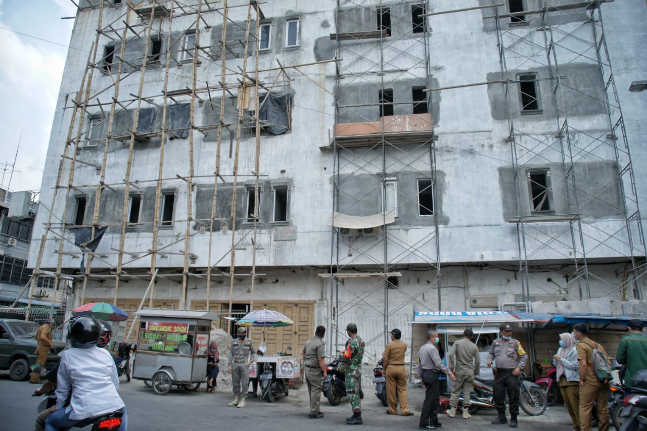 MEDAN – Tim gabungan Satpol PP Pemerintah Kota Medan melakukan penertiban terhadap bangunan yang tidak memiliki Surat Izin Mendirikan Bangunan (SIMB) di Jalan Merbau Kelurahan Sekip Kecamatan Medan Petisah, Senin (8/2). Pasalnya, bangunan tersebut hanya memiliki izin membangun sebanyak 5 lantai saja, namun pemilik bangunan malah mendirikan sebanyak 6 lantai. Hal tersebut tentunya menyimpang dari SIMB No 0084/0084/1380/2.5/1103/01/2020 Tanggal 4 Februari 2020.
