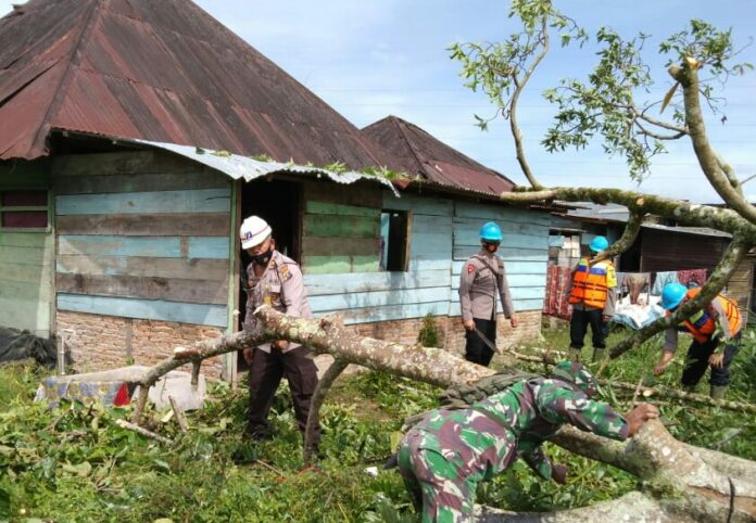 Personil turun membantu warga dalam proses pemulihan bangunan rumah yang rusak. Mengumpulkan atas seng dan kayu yang masih bisa digunakan serta membersihkan jalan desa yang tertutup akibat pohon tumbang,aku  Simanjuntak salah seorang korban.