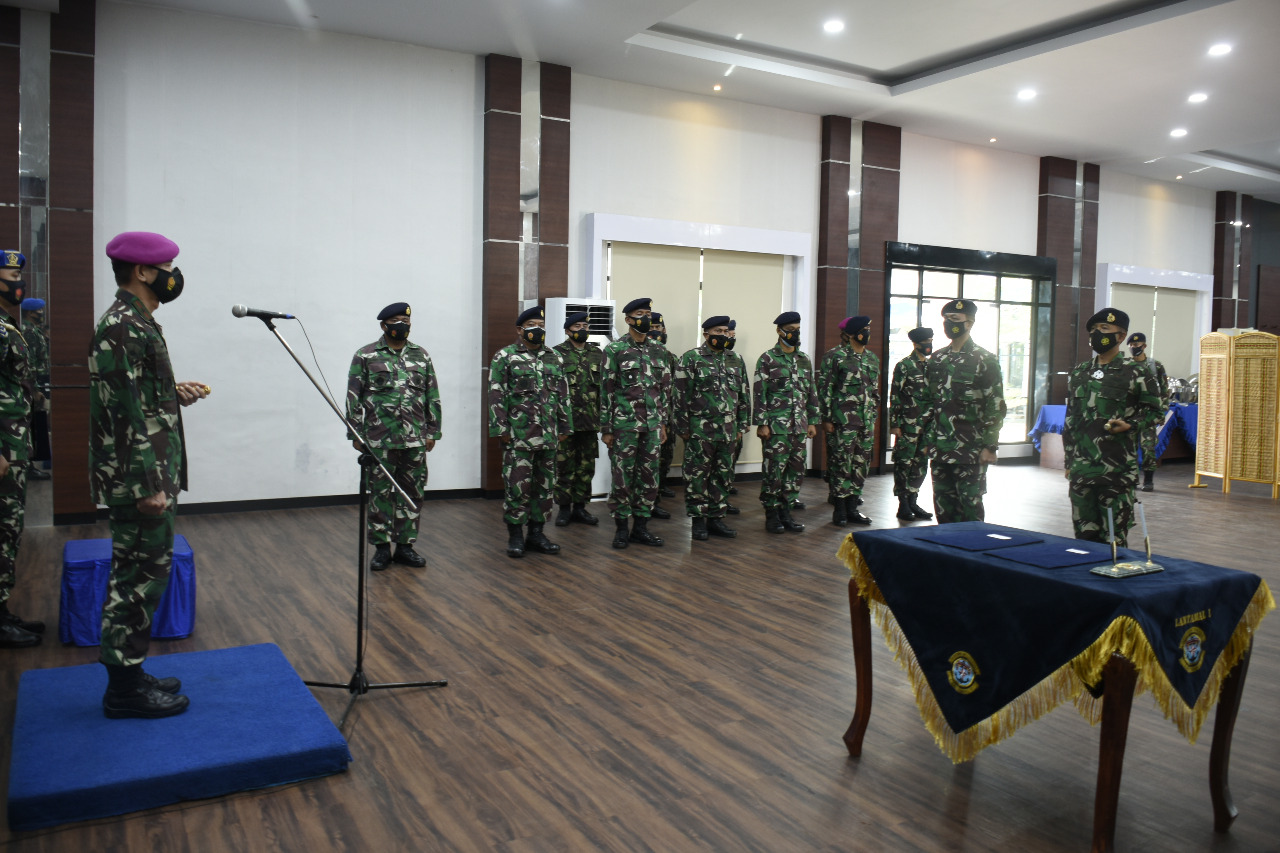 BELAWAN-Kolonel Laut (P) Ardhi Sunaryo, S.T.,M.M., Menerima Kemudi untuk menakhodai Pangkalan TNI Angkatan Laut Sabang yang baru pada acara serahterima Jabatan bertempat di Gedung Yos Sudarso Mako Lantamal I Belawan, Selasa (09/03/2021)