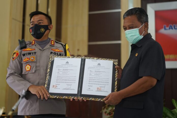 Hari ini di gedung Graha Bhayangkara Kapolres beserta Korp Bhayangkara menyerahkan ratusan kantong “GeNose” serta seperangkat mesin pendeteksi kepada Pemerintah Kabupaten (Pemkab) melalui Dinas Kesehatan Pacitan.