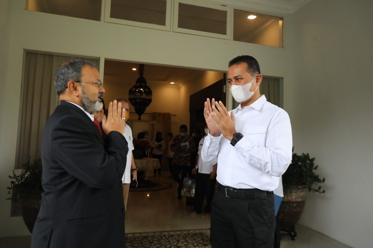 MEDAN – Wakil Gubernur (Wagub) Sumatera Utara (Sumut) Musa Rajekshah menerima kunjungan resmi kenegaraan Duta Besar Luar Biasa dan Berkuasa Penuh Dubes India untuk Indonesia Manoj Kumar Bharti di Rumah Dinas Wagub Sumut di Jalan Teuku Daud Medan, Rabu (3/3/2021).