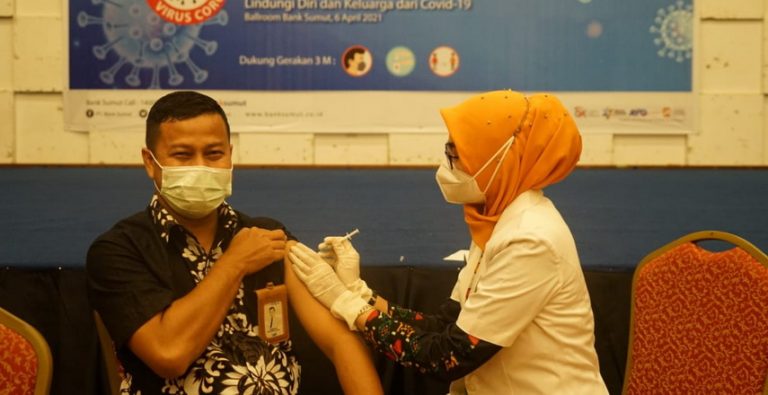 MEDAN – Sebanyak 200 pegawai Bank Sumut di wilayah kerja Kota Medan mengikuti Vaksin Sinovac Biofarma, untuk pencegahan dan pembentukan antibodi Covid-19, bertempat di Ballroom Bank Sumut, Selasa (6/4/2021).