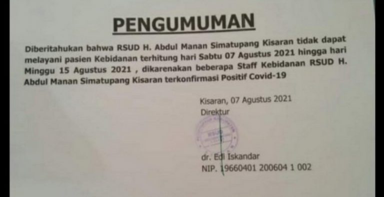 Demikian pengumunan yang ditandatangani Direktur RSUD HAMS Kisaran dr Edi Iskandar. Pengumuman tersebut tertempel pada dinding pengumuman Rumah Sakit Pemkab Asahan tersebut, Sabtu (7/8/2021).