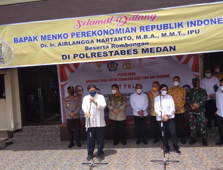 MEDAN – Menko Perekonomian RI Airlangga Hartanto MBA, MMT, IPU salurkan Bantuan Tunai Untuk Pedagang Kaki Lima dan Warung (BTPKLW) di Mapolrestabes Medan, Kamis (9/9/2021).