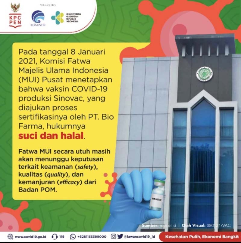 Saat ini Fatwa MUI secara utuh masih menunggu keputusan, terkait keamanan (safety), kualitas (quality) dan kemanjuran (efficacy) dari Badan Pengawas Obat dan Minuman (BPOM) Republik Indonesia.