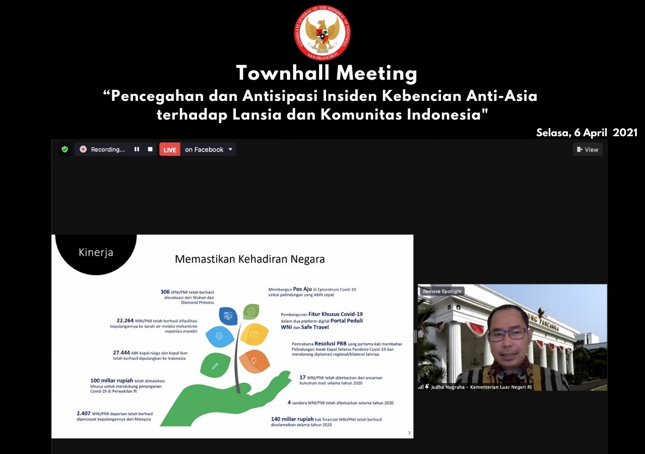 San Francisco, Amerika Serikat – Menyikapi maraknya aksi kekerasan bermotif rasial terhadap komunitas Asia di Amerika Serikat dalam 3 bulan terakhir, KJRI San Francisco menyelenggarakan pertemuan daring dengan masyarakat dan diaspora Indonesia di wilayah kerjanya (06/04/2021).
