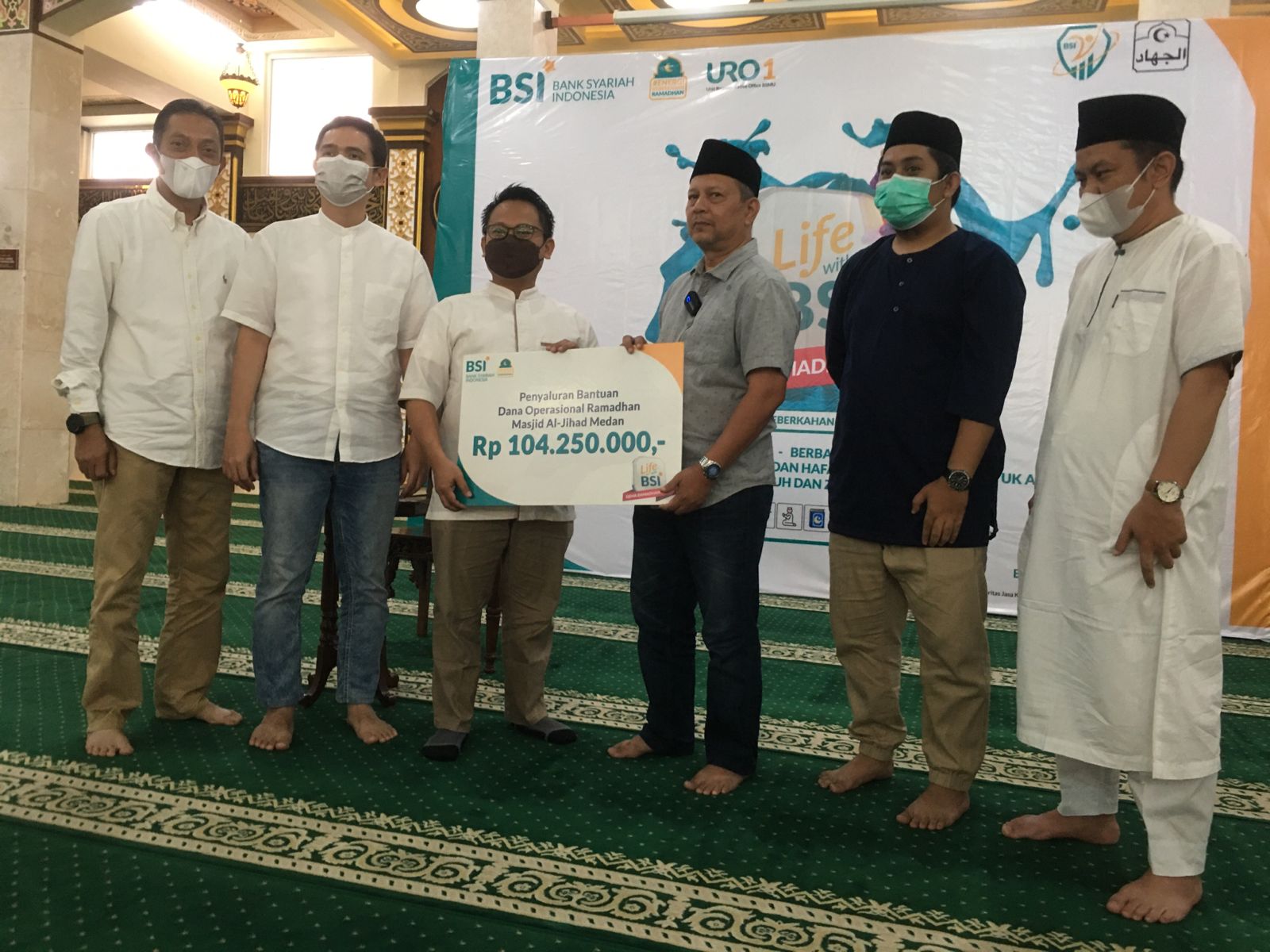 MEDAN – Manajemen Bank Syariah Indonesia (BSI) menyalurkan bantuan Ramadan kepada Masjid Al Jihad Jalan Abdullah Lubis Medan senilai total Rp 162.250.000 untuk kegiatan Ramadan 1443 H, Rp 104.250.000 diantaranya dalam bentuk tunai.