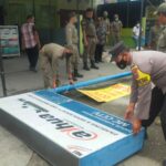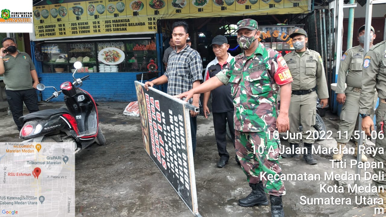 MEDAN-Tim gabungan Kecamatan Medan Marelan menyikat papan reklame tak berizin di sepanjang Jalan Marelan Raya, Jumat (10/6/2022).
