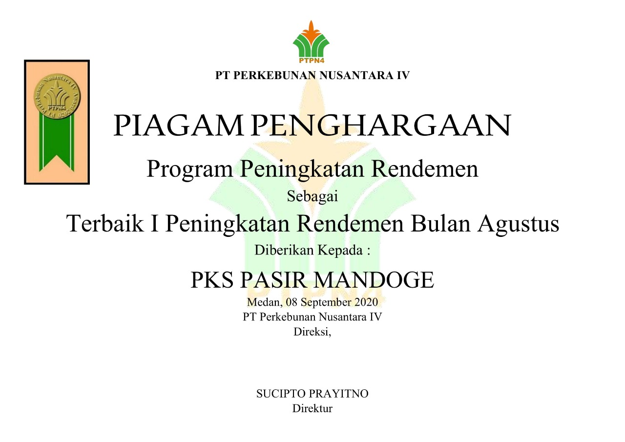 Pada periode Agustus 2020 ini kata Sucipto Prayitno, untuk program peningkatan rendemen minyak sawit tertinggi sebagai Juara I diraih PKS Pasir Mandoge, Juara II PKS Air Batu dan Juara III PKS Ajamu.