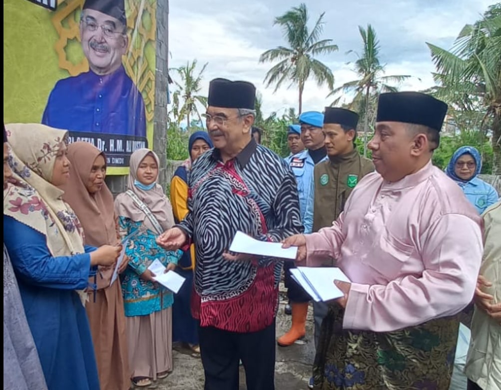 Medan – Presiden Dunia Melayu Dunia Islam (DMDI), Tun Seri Setia HM Ali Rustam memberikan bantuan tali asih berupa uang tunai sebesar Rp 400 juta kepada 85 guru ngaji yang terdampak Gempa Magnitudo di Kabupaten Cianjur, Jawa Barat, Jumat (9/12/2022).