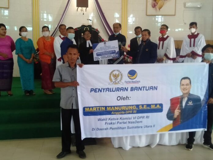Wakil Ketua Komisi VI DPR RI Martin Manurung Dari Fraksi Partai NasDem Melalui Kordinator Kabupaten Labuhanbatu T.turnip dan Kordinator kecamatan bilah barat Firmansyah Ginting bersama rombongan NasDem menyerahkan bantuan tersebut dan dalam sambutannya menyampaikan, pemberian bantuan ini Adalah Aspirasi dari fraksi Partai NasDem dan  bagi rumah ibadah bukan hal baru lagi.”Ujarnya