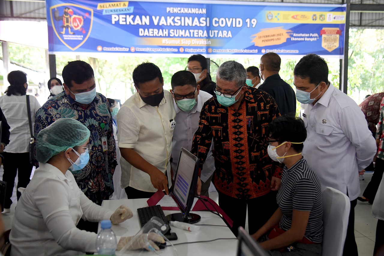 MEDAN – Satuan Tugas (Satgas) Penanganan Covid-19 Sumatera Utara (Sumut) melakukan Pencanangan Pekan Vaksinasi Covid-19 Daerah Sumatera Utara, di Pendopo Universitas Sumatera Utara (USU), pada Rabu (10/2/2021). Tujuannya untuk mempercepat pelaksanaan vaksinasi Covid-19 kepada para dokter dan tenaga kesehatan di daerah tersebut.