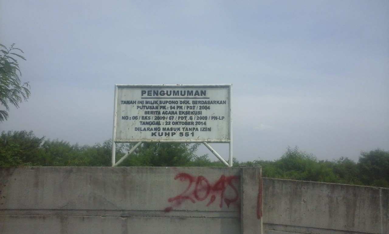 Berdasarkan informasi itu, Tim poskotasumatera.com menyambangi lahan yang dikliem milik Marwita itu. Benar saja, diatas lahan itu terpasang tembok dan berdiri plank bertuliskan, ‘PENGUMUMAN’ TANAH INI MILIK SUPONO DKK BERDASARKAN PUTUSAN PK: 94 PK/PDT/2004 BERITA ACARA EKSEKUSI NO:06/EKS/2009/67/PDT.G/2009/PN-LP TANGGAL:22 Oktober 2014. DILARANG MASUK TANPA IZIN KUHP 551.