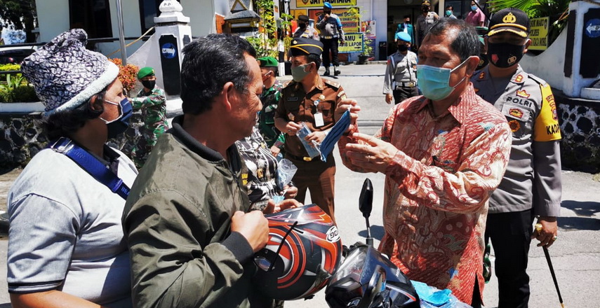 KARO – Bupati Karo Terkelin Brahmana SH MH saat mengikuti kampanye penerapan AKB (adaptasi kebiasaan baru) dan penyerahan masker kepada masyarakat, sempat menyetop pengendara sepeda motor yang tidak menggunakan masker di Jalan Veteran Kabanjahe, Kamis (10/9/2020).