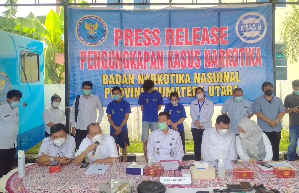 MEDAN – Badan Narkotika Nasional Provinsi (BNNP) Sumatera Utara (Sumut) mengamankan 47 orang terduga Narkoba dari Fakultas Ilmu Budaya Universitas Sumatera Utara (USU), Sabtu (11/10/2021) malam. Setelah melakukan pemeriksaan, BNN menetapkan 3 orang tersangka. Sejumlah barang bukti turut diamankan.
