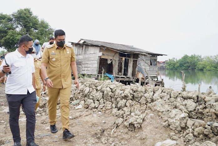 Bobby Nasution didampingi Kepala Dinas Perumahan Kawasan Permukiman dan Penataan Ruang (PKPPR) Kota Medan Benny Iskandar dan Camat Medan Labuhan Rudi Asriandi, mengunjungi warga Lingkungan VII, Kelurahan Nelayan Indah, Kecamatan Medan Labuhan, Senin (10/05/2021) pagi.