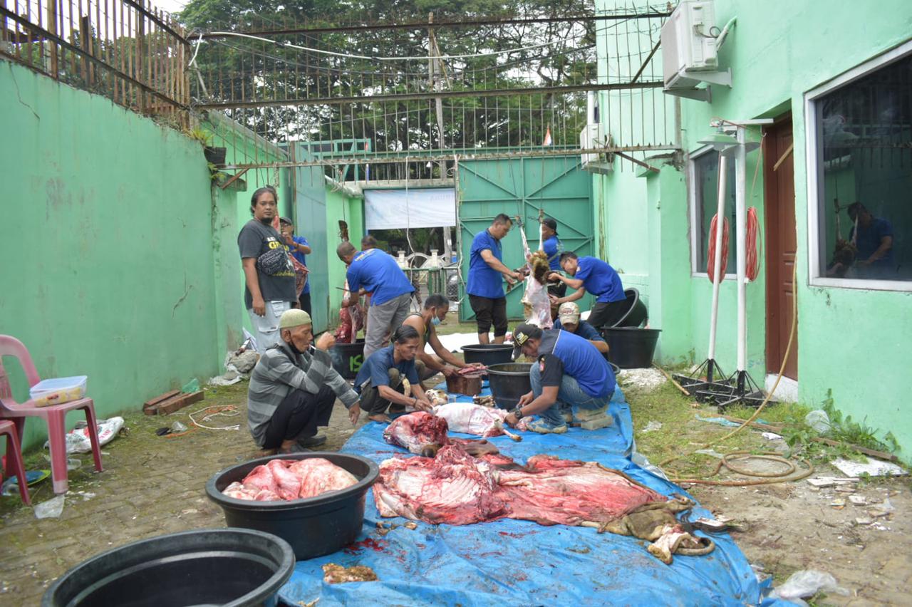 MEDAN-Di Hari Raya Idul Adha 1443 Hijriyah, Pengurus Karang Taruna Kota Medan melaksanakan kegiatan pemotongan hewan qurban di Sekretariat Karang Taruna Kota Medan Jalan GM Panggabean, Senin (11/7/2022).