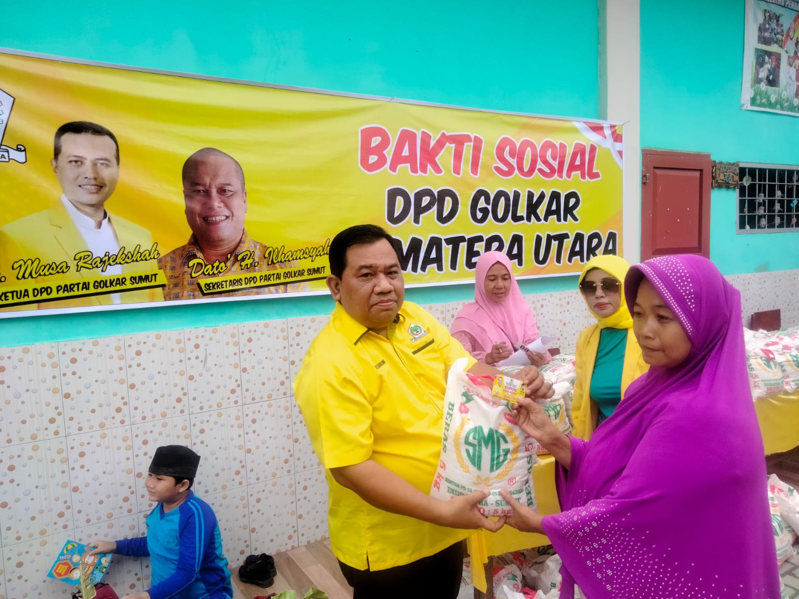 MEDAN-Pengurus DPD Partai Golongan Karya (Golkar) Provinsi Sumatera Utara menyalurkan 200 goni beras murah isi 5 kg kepada ratusan ibu-ibu di Gang Manggis Kelurahan Besar Kecamatan Medan Labuhan Kota Medan (10/09/2022).