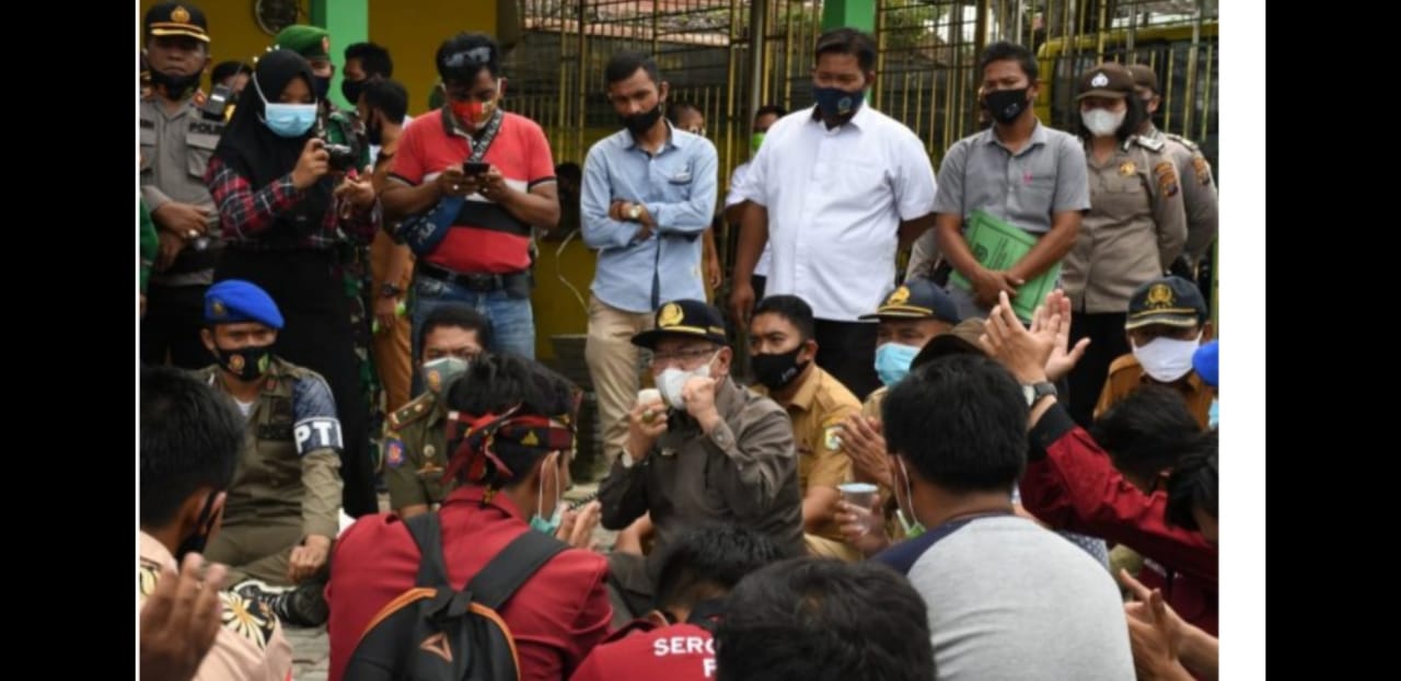 SEI RAMPAH – Ratusan masyarakat yang tergabung dalam Aliansi Serdang Bedagai Bersatu (SERBU) mendatangi Kantor Bupati Serdang Bedagai (Sergai) di Sei Rampah, Senin (12/10/2020) untuk menyuarakan pernyataan sikap terhadap pengesahan Undang-Undang (UU) Omnibus Law/Cipta Kerja.