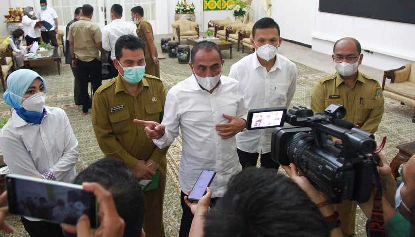 “Kepada bupati dan walikota sesuai dengan kondisi, kalau sudah usia lanjut (60 tahun ke atas) jangan, komorbid jangan. Bila bupatinya tidak bisa, wakilnya, begitu juga dengan walikota, kalau tidak bisa juga Sekdanya, kalau tidak bisa juga asisten, kalau Kadiskes wajib karena tenaga kesehatan,” terang Edy Rahmayadi yang didampingi Kadiskes Sumut Alwi Mujahit dan Kadis Kominfo Sumut Irman Oemar.