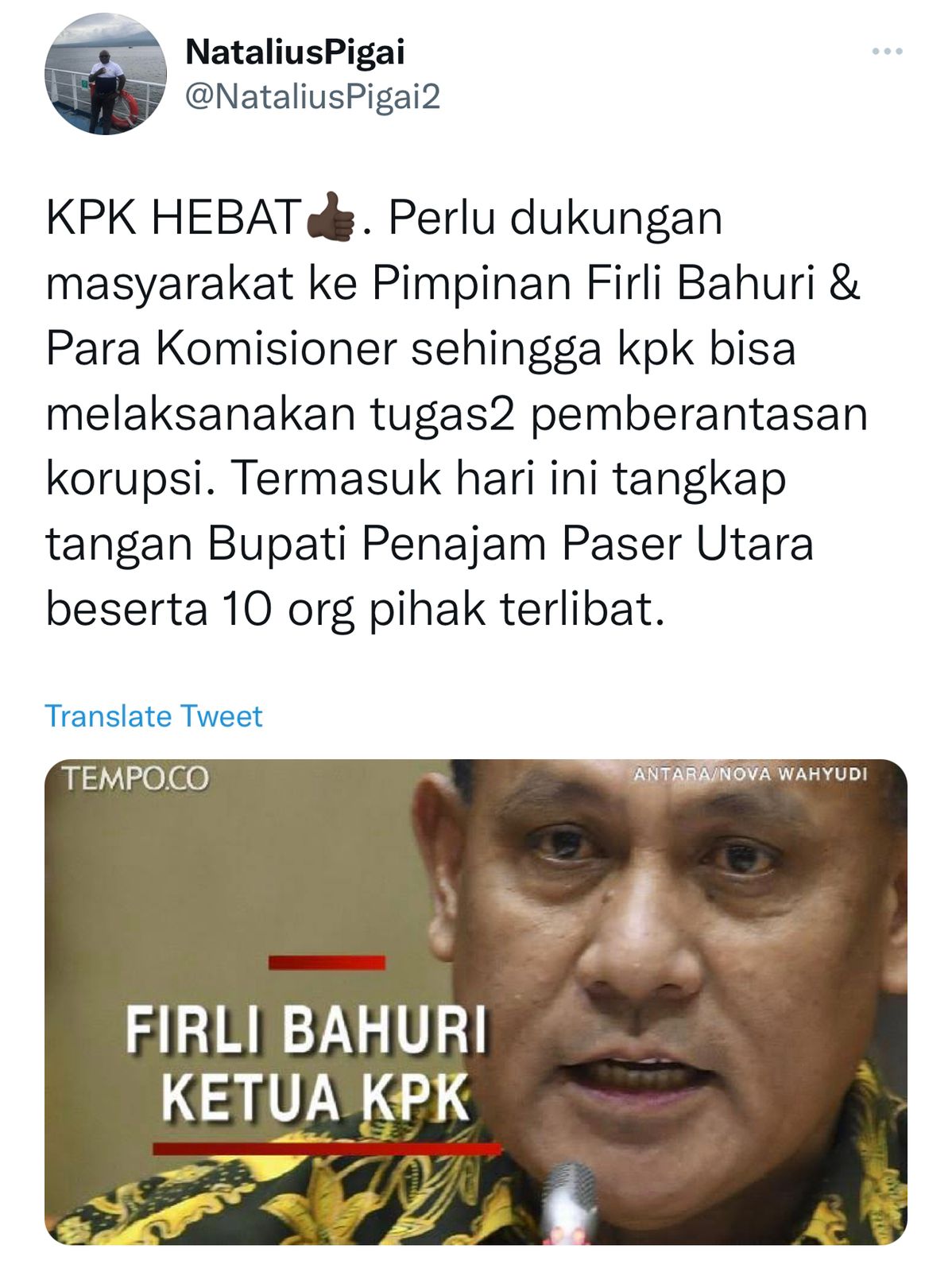 “KPK Hebat (emoji jempol). Perlu dukungan masyakarat ke Pimpinan Firli Bahuri & Para Komisioner sehingga KPK bisa melaksanakan tugas tugas pemberantasan korupsi,” sebut Natalius Pigai dalam twet di Twitter @NataliusPigai2, Kamis (13/1/2022).