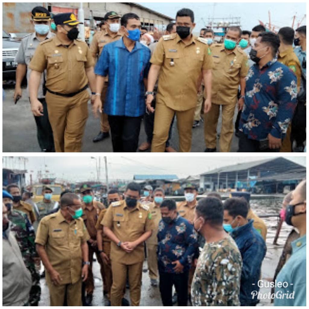 BELAWAN-Walikota Medan Muhammad Bobby Afif Nasution didampingi HNSI Sumut, Kepala Dinas Perikanan, Pertanian dan Peternakan Kota Medan Iksar Marbun berkunjung ke Pelabuhan Perikanan Samudera Belawan (PPSB), Gabion, Belawan, Selasa (13/4/2021).