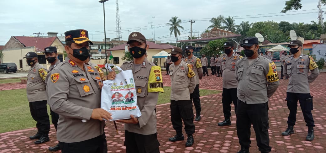 Polres Batubara dalam hal ini melakukan Pembagian Bantuan tali asih dan Sembako kepada Para Bhabinkamtibmas di seluruh Jajaranya.dalam apel Pagi di Mako Polres Batubara, Selasa ( 13/7/2021).