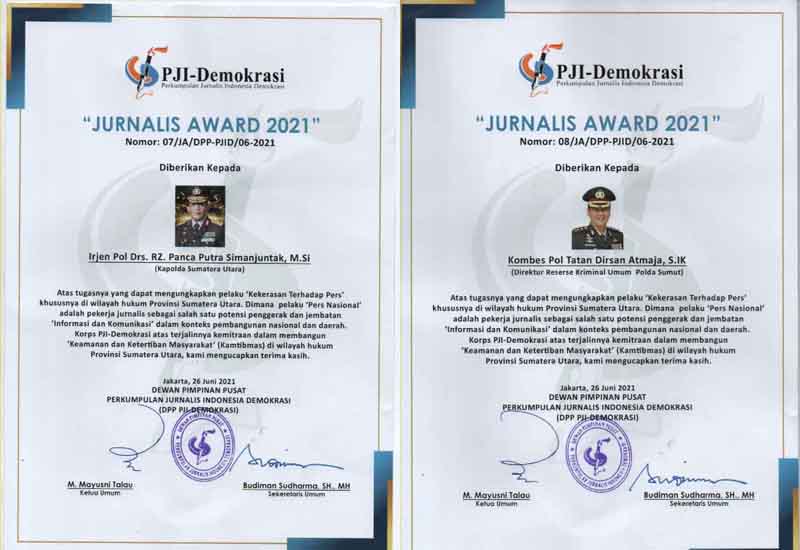 Dijelaskannya, Jurnalis Award 2021 PJI Demokrasi telah disampaikan ke kepada Kapolda Sumut Irjen Pol Drs RZ Panca Putra S Msi dan Dirreskrimum Polda Sumut Kombes Tatan Dirsan Atmaja SIK melalui Pengurus DPD PJI Demokrasi Sumut.