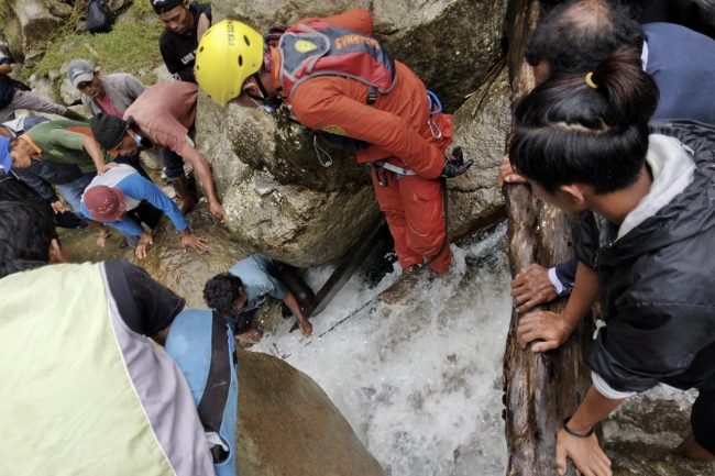 Dengan menggunakan peralatan mountaineering, petugas kemudian mencoba menuruni sisi tebing untuk mengangkat korban dari dalam sungai. Petugas juga harus membuat sistem tali temali untuk mempermudah evakuasi.