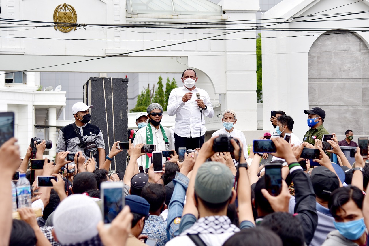 MEDAN-Gubernur Sumatera Utara Edy Rahmayadi turun langsung menemui massa Aliansi Nasional Anti Komunis (ANAK NKRI) Sumatera Utara yang menyampaikan aspirasi menolak UU Omnibus Law.