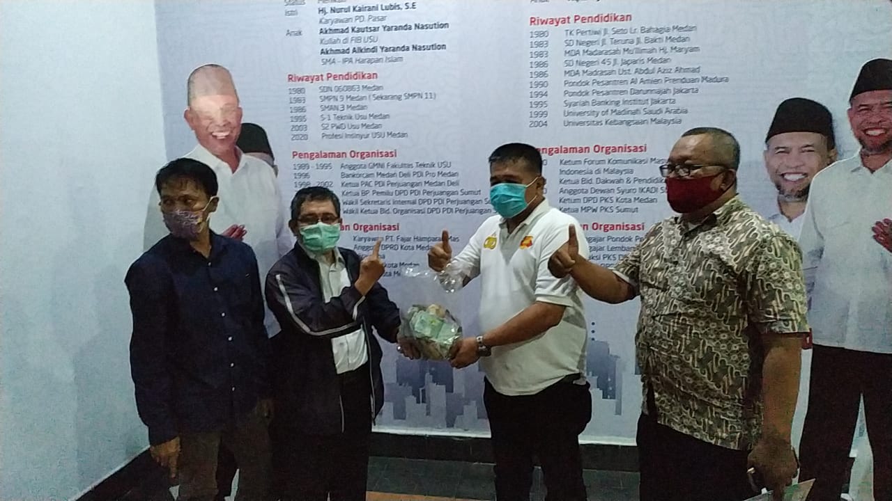 MEDAN-Sekelompok warga Kota Medan yang mengatasnamakan Gerakan Al Maun mendatangi Posko Pemenangan Akhyar – Salman (AMAN) yang terletak di Jalan Sudirman Medan, Senin (12/10/2020) sore. Mereka menyerahkan bantuan dana yang terbungkus plastik. Bantuan yang diterima langsung Ketua Tim Pemenangan AMAN, Ibrahim Tarigan, berisikan uang tunai dimulai pecahan Rp2 ribu hingga Rp50 ribu.