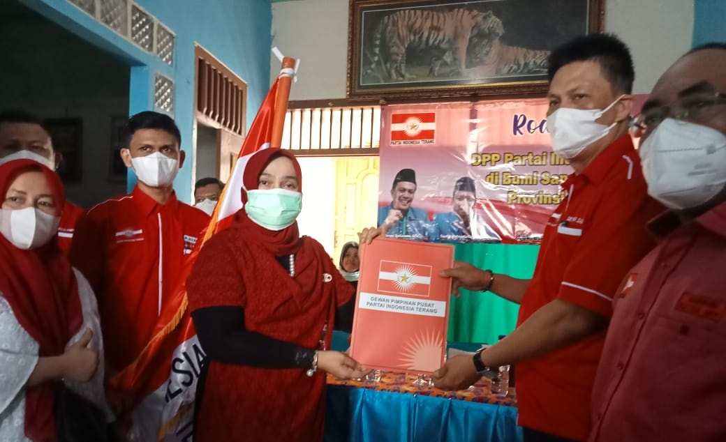 LAMPUNG – Presiden Partai Indonesia Terang (Pinter), Hj Rizayati SH MM, menyerahkan Surat Keputusan (SK) kepada Ketua Dewan Pimpinan Daerah (DPD) I Provinsi Lampung, H Iman Setiawan SE.