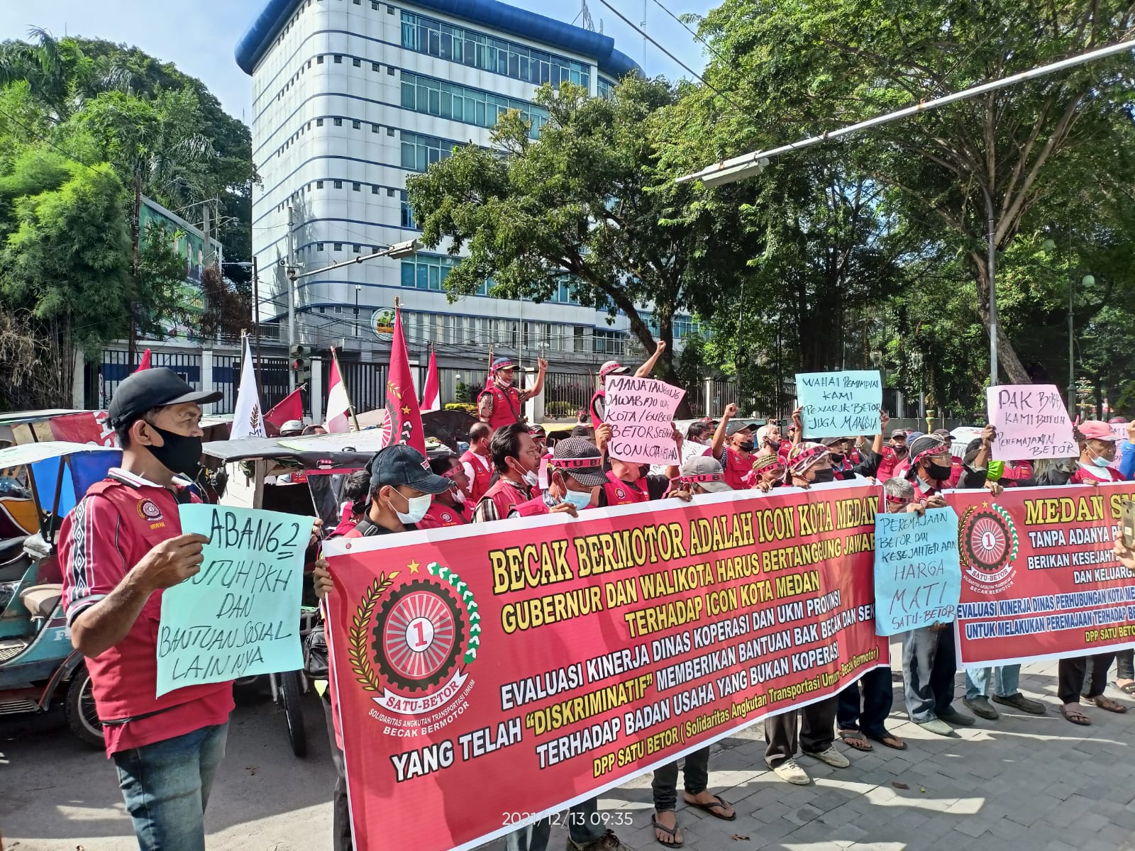 MEDAN – Ratusan penarik becak bermotor (Betor), yang tergabung di Solidaritas Angkutan Transportasi Betor (SATU BETOR) melakukan aksi demo didepan kantor wali kota Medan Jalan Maulana Lubis, Medan, Senin (13/12/2021).