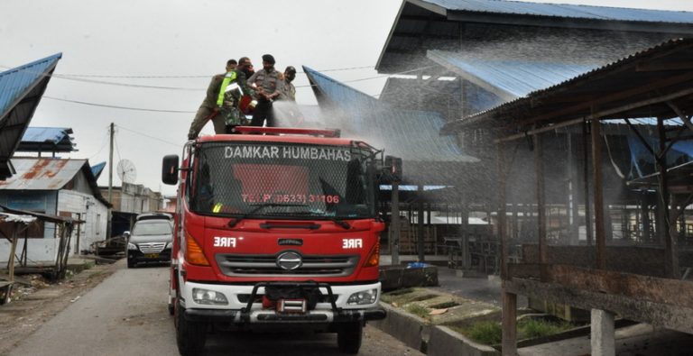 HUMBAHAS – Polres Humbahas bersama tim gabungan menyemprotkan cairan disinfektan di sejumlah tempat, Selasa (13/7/2021). Hal itu sebagai upaya mencegah penyebaran Covid-19 di Kabupaten Humbahas.