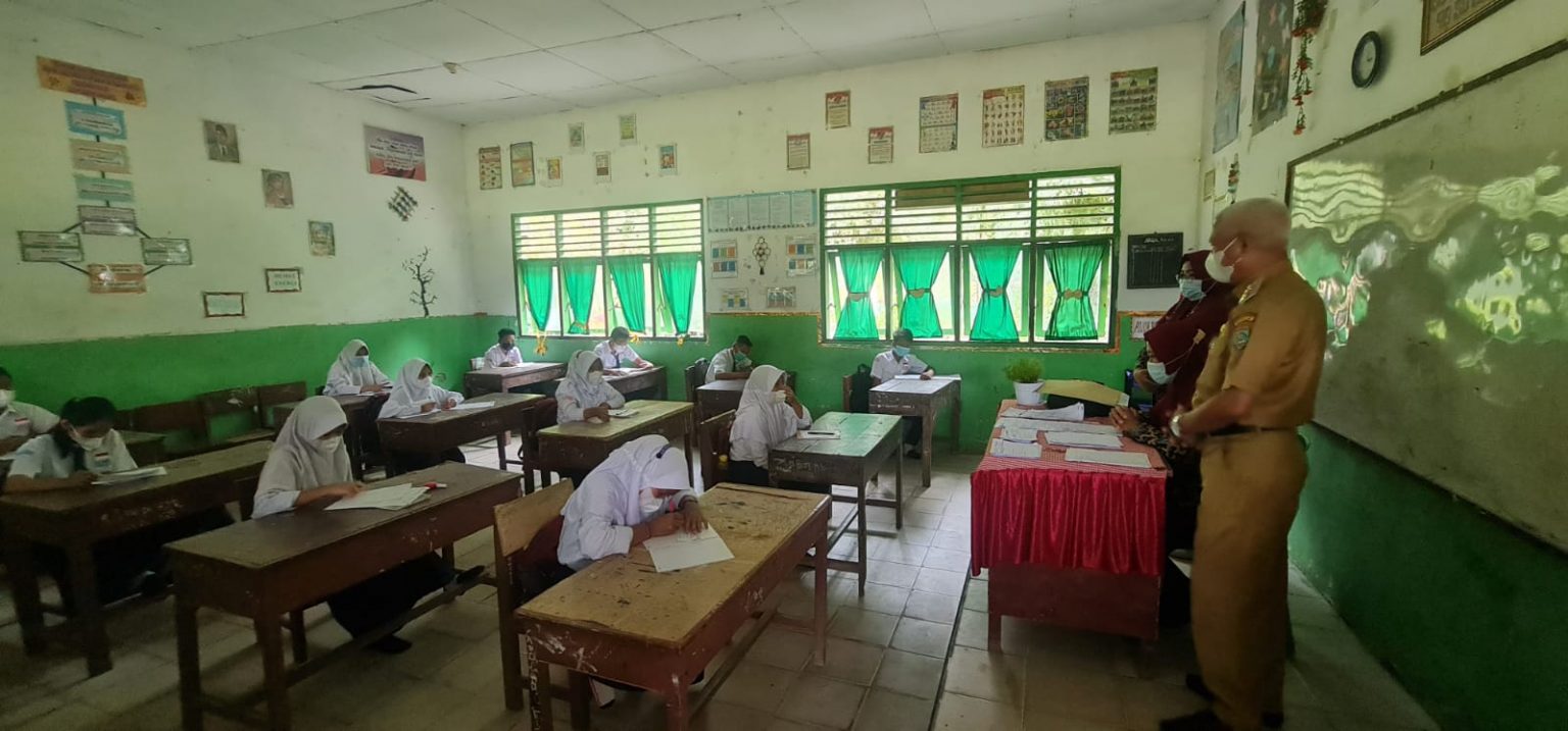 KISARAN – Bupati Asahan H. Surya, BSc didampingi Kepala Dinas Pendidikan Kabupaten Asahan  Drs. Sofian, MPd, Kepala Dinas Kominfo dan OPD terkait melakukan peninjauan pelaksanaan pembelajaran tatap muka (PTM)  di SD 014646 Air Teluk Kiri, Kecamatan Teluk Dalam dan di SMP I Pulo Rakyat, Selasa (14/9/2021).