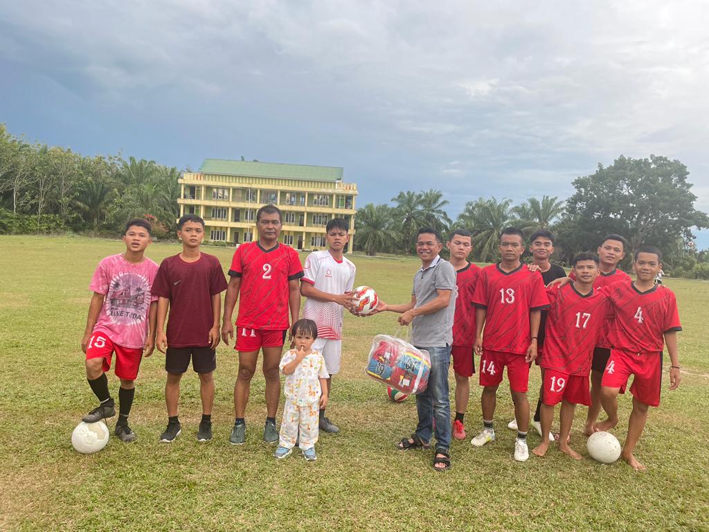PALUTA-Wakil Ketua DPD Gerindra Sumut, Zakiyuddin Harahap, bagikan baju club sepak bola dan bola kaki ke santri Pesantren Almukhtariya di Paluta. Zakiyuddin dukung olahraga sepakbola di lingkungan pesantren.