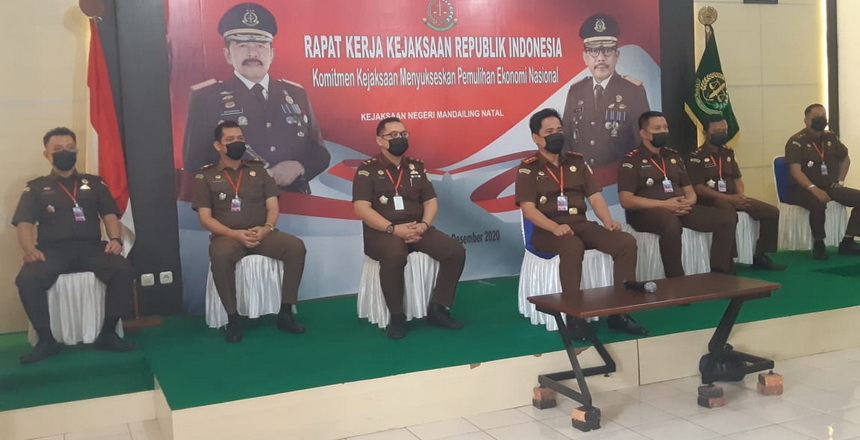 MADINA – Kejari Madina (Kejaksaan Negeri Mandailing Natal) mengikuti rapat kerja (Raker) secara virtual, Senin (14/12/2020), dari Lantai 2 Aula Kejari Madina. Raker itu sendiri berlangsung secara nasional dengan tema ‘Komitmen Kejaksaan Menyukseskan Pemulihan Ekonomi Nasional (PEN)’.