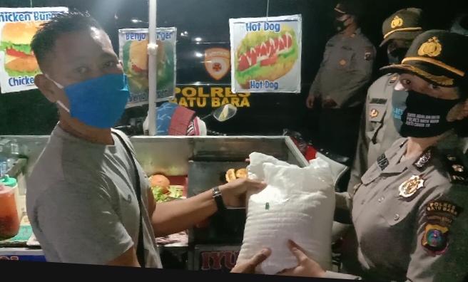 Terpantau awak media, Rabu (9/12/2020) 3 PJU Polres Batubara terlihat sedang memberikan bantuan sembako kepada para pedagang Sate, Jagung Bakar dan Gorengan di Taman Bermain Kota Lima Puluh Kabupaten Batubara.