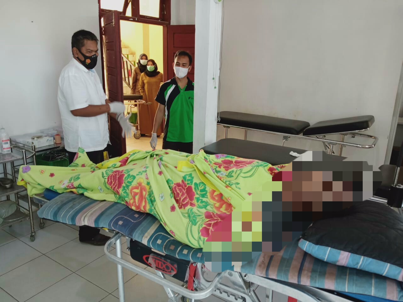 Kemudian bersama-sama berangkat ke TKP dan setelah sampai di TKP benar menemukan mayat laki-laki di dalam kantor tersebut dengan posisi terlentang dan ditutup Satu helai selimut warna hijau bermotif bunga,