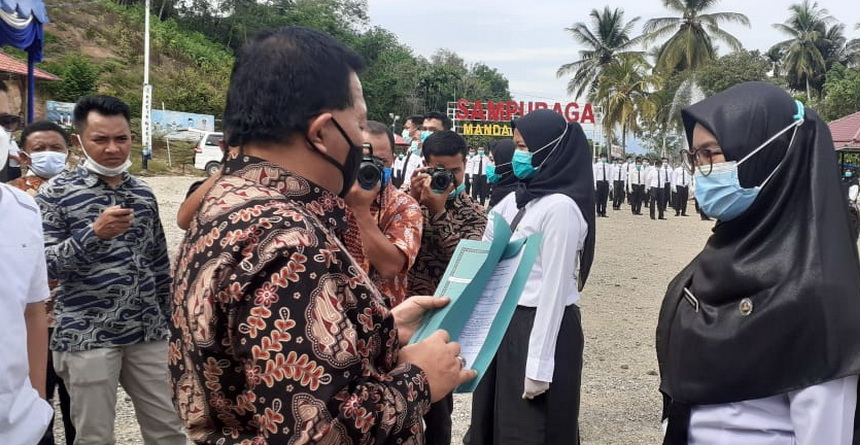 Dengan menerapkan protokol kesehatan, penyerahan petikan SK CPNS di tempat wisata Sampuraga Desa Sirambas Kecamatan Panyabungan Barat Provinsi Sumatera Utara tersebut berjalan dengan lancar.